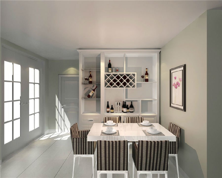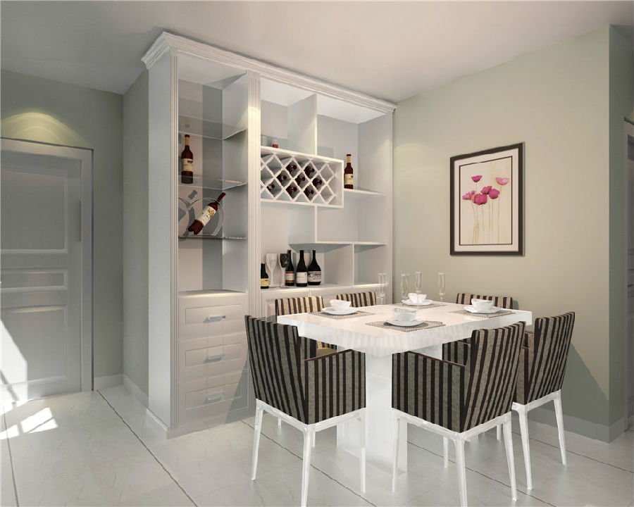 整體色彩采用純白色系,大面積的使用,使整體格局顯得十分整潔與開闊,空間十足,純白色的酒柜與整體風(fēng)格相呼應(yīng),在收納面積增大的同時,也展現(xiàn)了收納的美學(xué)。
